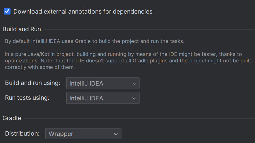 File > Settings > Build, Execution, Deployment > Build Tools > Gradle으로 이동한다.